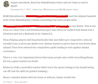 Examples would be like footnotes in BORI also say that karna was dambodbhava in his former life they also mention that bheem defeated karna during sabha parva when the pandavas were sent to collect tributes from various nations. So if a person uses footnotes to say Shiva did not lose or was absent from khandava daha then they also need to admit karna lost to bheem in rajasuya & that karna was dambodbhava in his previous life. If a person does not do that then they should be considered a hypocrite.